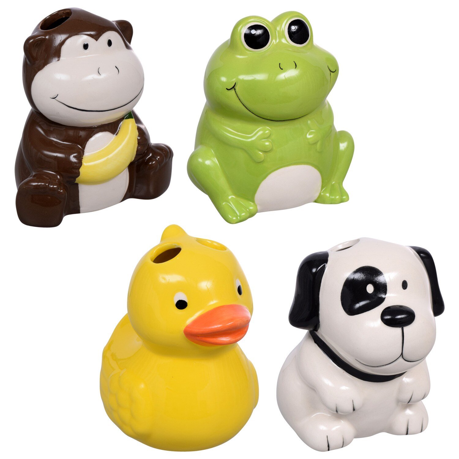 Brushing your teeth has never been more fun with adorable animal-shaped toothbrush holders. Ceramic toothbrush holders hold 2 individual toothbrushes and come assorted among monkey, frog, duck, and dog themes and add a fun touch to bathrooms in restaurants, stores, offices, and at home.