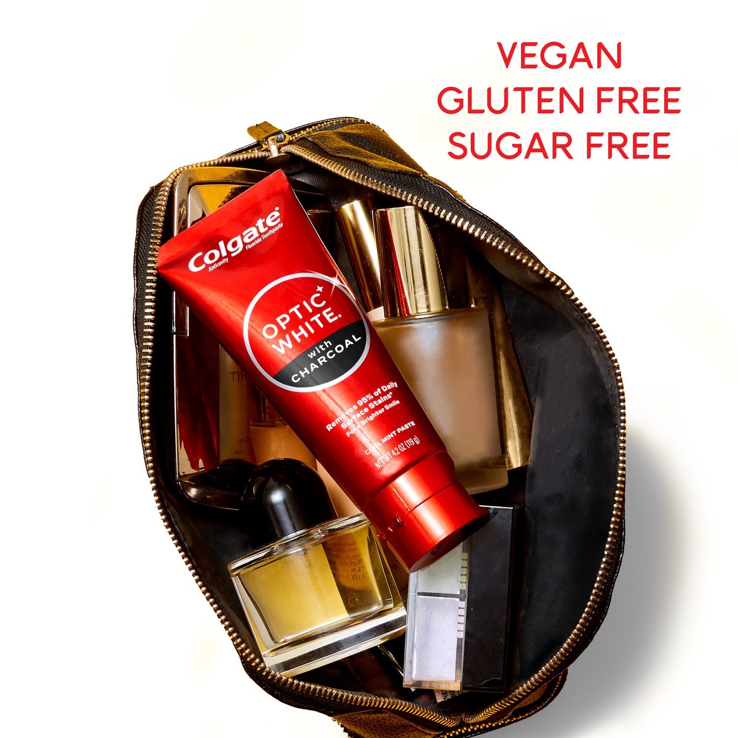 The Colgate Travel Size Optic White Whitening Toothpaste With Charcoal is a travel size whitening toothpaste with charcoal removes 95% of daily surface stains for a brighter smile. This is a sugar free and vegan toothpaste that is enamel-safe for daily use. This teeth whitening toothpaste is also an anticavity fluoride toothpaste to help prevent cavities. Just take a pea sized amount of toothpaste and ensure to brush two times a day for the best results.