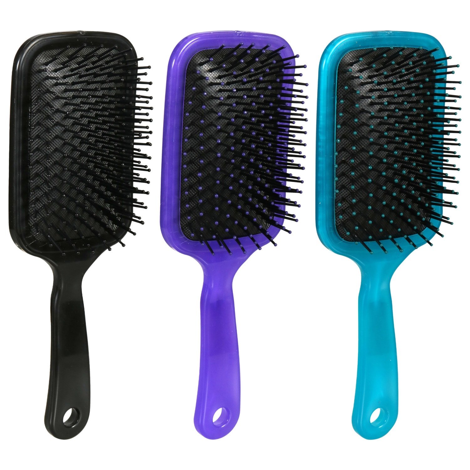 Upgrade your beauty routine without breaking the bank! These Cushioned Plastic Paddle Brushes are an excellent value. They are assorted among 3 exciting styles. These brushes have plastic bristles with rubbery tips and a cushioned pad to protect hair and scalp while brushing and styling. Plus, their tapered handles let you keep a firm grip. Stock up and share! These brushes are perfect for replacements, stocking stuffers, travel, care packages, gift additions, guest rooms, and more.